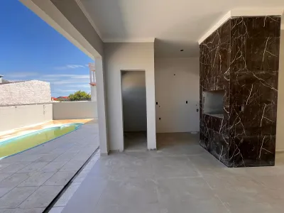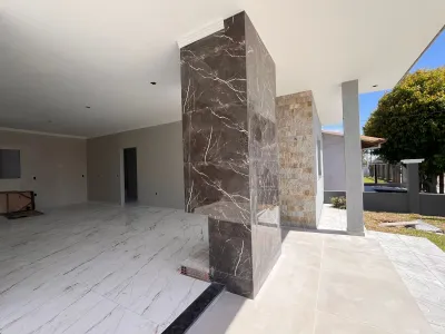 cozinha, sala de estar e jantar, lareira, área de serviço, abrigo 02 carros, piscina, churrasqueira, porta de entrada de alumínio ripado, restante das abertura alumínio preto, cerca de vidro transparente, laje maciça, telha de concreto plana